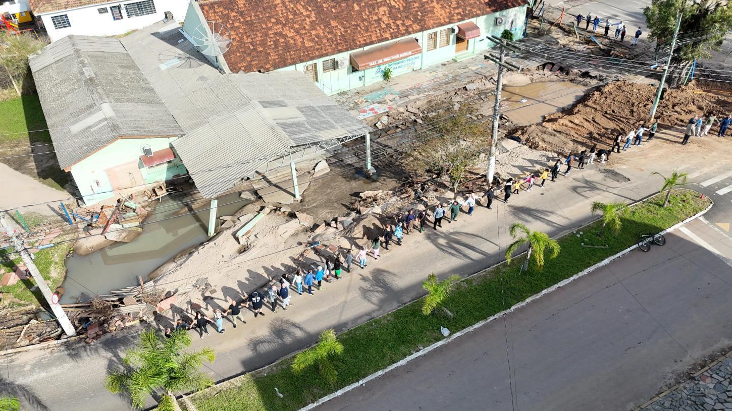 Moradores do bairro Loteamento do Engenho "abraçaram" simbolicamente a escola estadual Ismael Chaves Barcellos no dia 1º. Com 140 estudantes de ensino fundamental, a instituição de mais de 60 anos de história foi uma das mais atingidas na enchente que devastou Guaíba e grande parte do Rio Grande do Sul em maio.