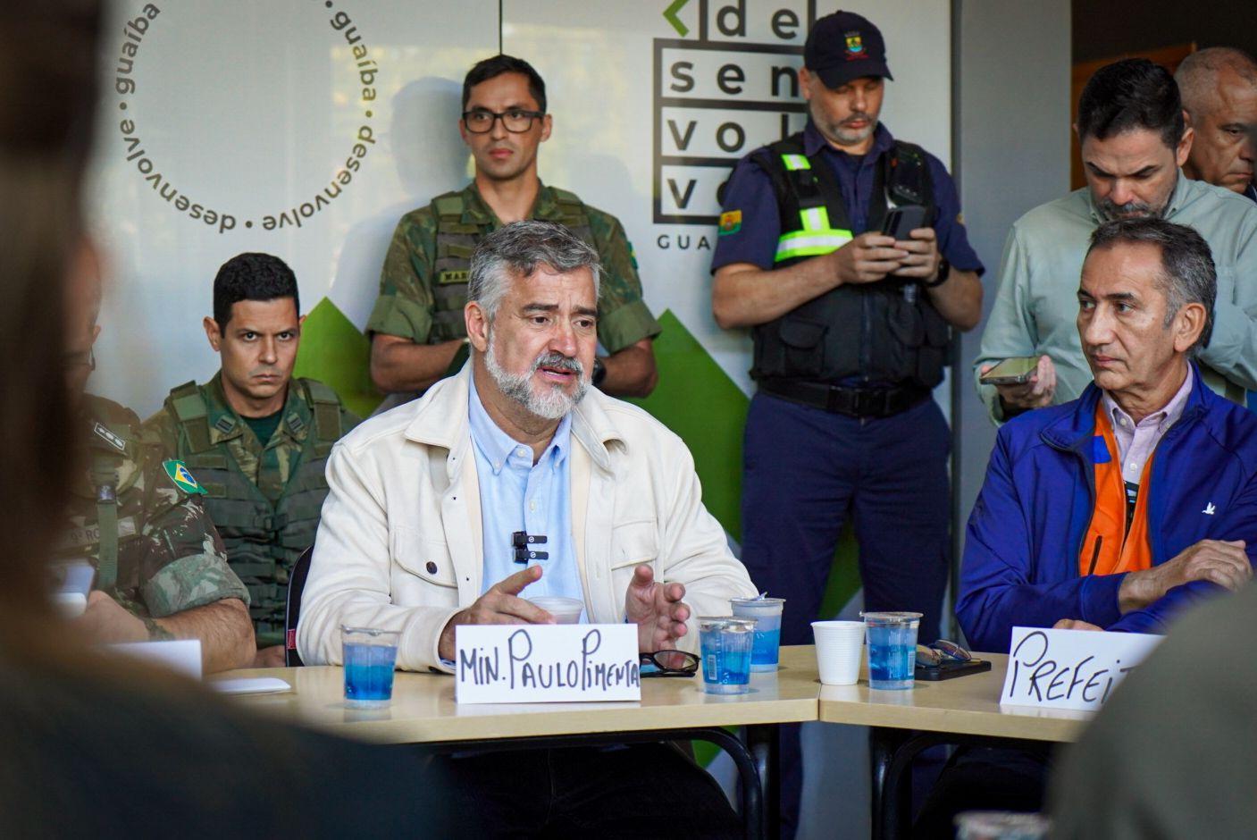 Ministros pousaram de helicóptero na manhã do dia 9 para visitarem abrigos que estão recebendo as vítimas das enchente que atingiu Guaíba e Eldorado do Sul. Paulo Pimenta, da Secretaria Especial de Comunicação Social, e Walter Góes, do Ministério do Desenvolvimento Regional, também entregaram doações do governo federal de purificadores de água.