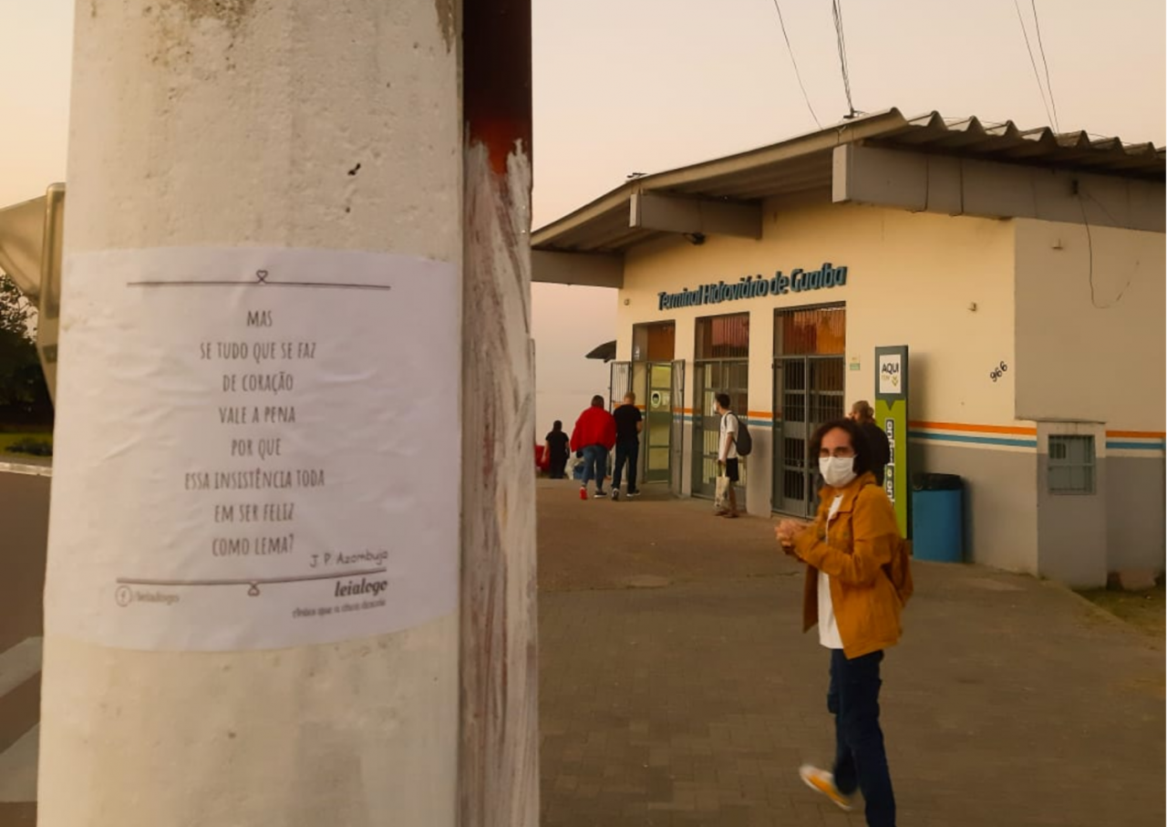 Escritores e poetas de Guaíba voltaram a espalhar poesias em diversos lugares de Guaíba. Anderson Kubiaki, Andrea Aquini e Marcelo Rutshell colocaram cartazes em formato de lambe-lambe com versos poéticos nos postes da cidade, em praças, parques, próximo à hidroviária e na orla revitalizada da Alegria.